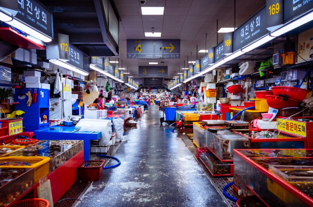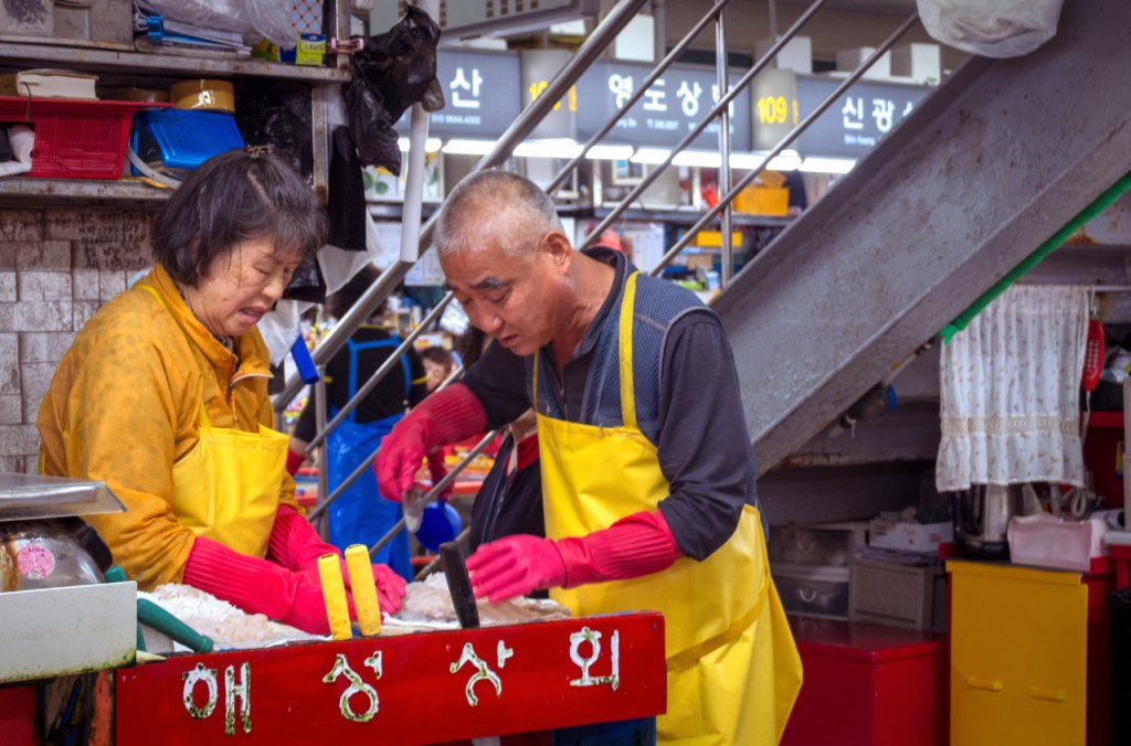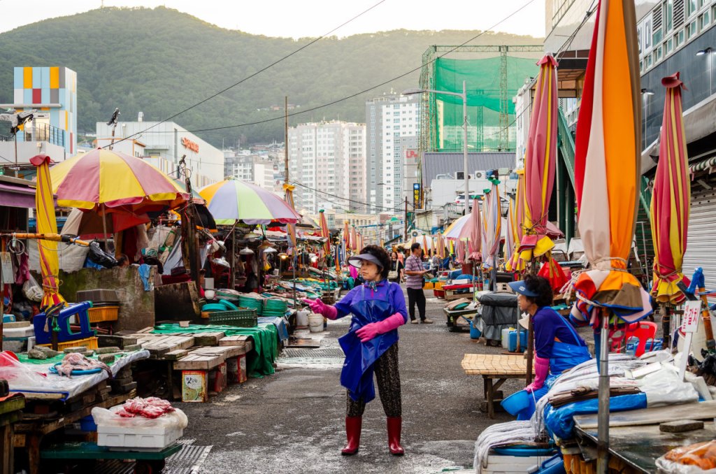 Der Jagalchi-Fischmarkt ist nichts für zarte Nasen, aber ein Paradies für Entdecker. Zwischen Tintenfischen, Seeigeln und frischem Sashimi entfaltete sich die Seele Busans – roh, direkt und ehrlich. Händlerinnen, die ihre Auslagen wie kleine Bühnen bespielen, gaben dem Ort seinen ganz eigenen Rhythmus.